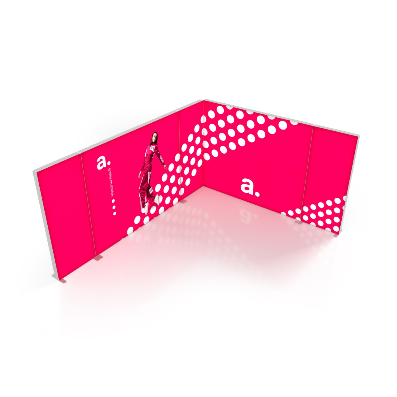 La struttura LED SEGO è un sistema espositivo illuminato che ti permette di creare un'area di lavoro confortevole alle fiere e di mettere in evidenza il tuo marchio. I moduli che compongono la struttura sono dotati di illuminazione LED montata sui bordi laterali. Questo garantisce che le stampe con le tue grafiche personalizzate siano illuminate in modo uniforme, rendendo così il messaggio promozionale ancora più visibile. I box commerciali indipendenti SEGO si basano su una struttura con profili in alluminio e l'intero allestimento si monta senza l'uso di alcun attrezzo.
